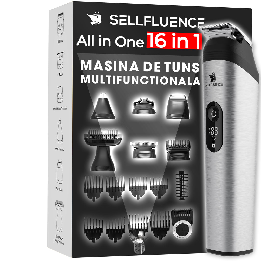 Masina de tuns si aparat de ras, Sellfluence All-in-One 16 in 1, par, barba, nas, inghinal si corp, rezistent la apa, wireless, 7000 rpm, autonomie 4-8 ore, negru/argintiu